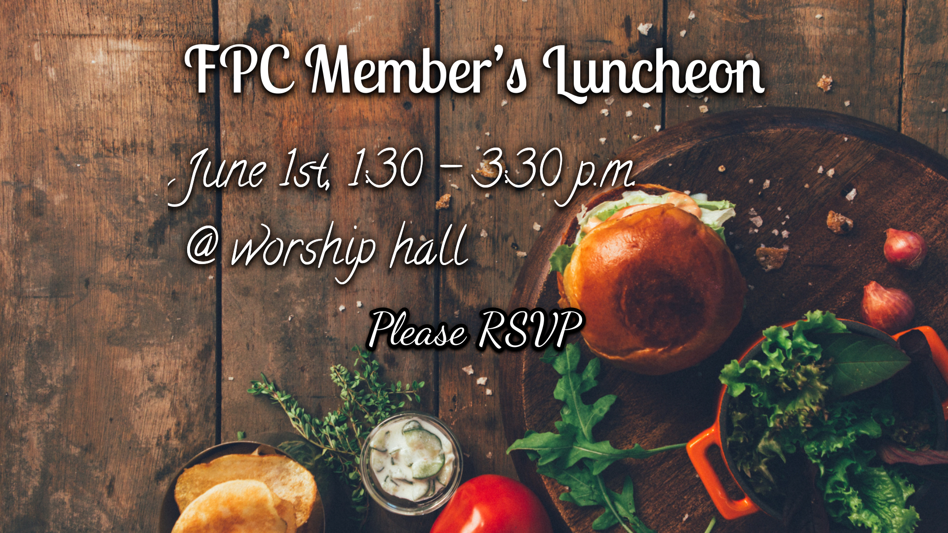 All church members of FPC, and their children, are invited to join us for fellowship on June 1 from 1:30 pm to 3:30 pm. It will be a chance for us to gather as a church family, eat delicious food, fellowship together, and welcome in the newest members of FPC. (Note: You may choose not to eat the food. In this case, we encourage you to still attend the gathering, but please bring your own lunch.)