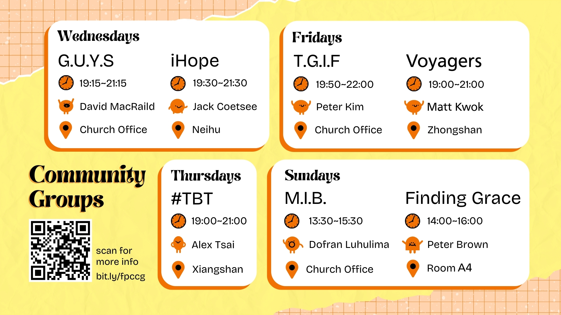 Wednesday evenings, 7:30-9:30pm, In Neihu at House of Praise. We are planning on going through Gospel-Centered Life. Contact group leader Jack Coetsee for details here.
